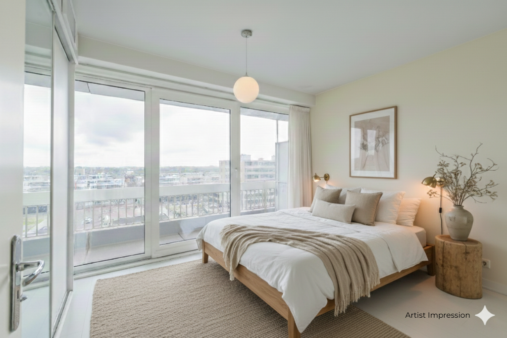 Met de lift bereikt u de 7e verdieping van het complex. Vanaf daar leidt een korte trap naar beneden u naar de 6e etage, waar het appartement zich bevindt.