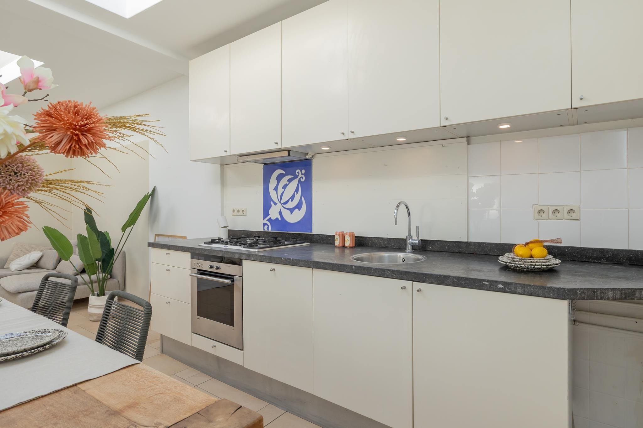 - Een royale woonkeuken met hoge lichtkoepels, een 5-pits Siemens fornuis met wokbrander, Siemens combimagnetron, vaatwasser.